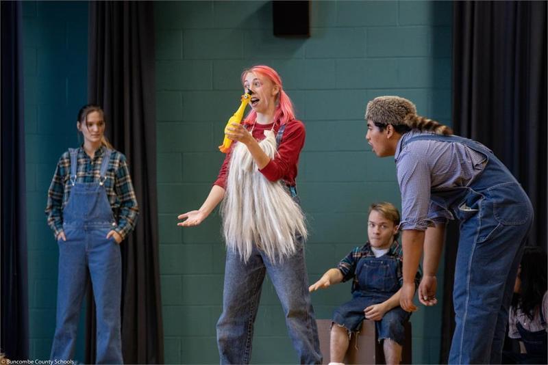 Enka High Theater Arts students have been traveling to all four Enka District elementary schools to perform “Tarheel Tales” – five short, dramatic sketches adapted from the stories collected by Richard Chase in “The Jack Tales” and “Grandfather Tales.” On March 2, the troupe visited Hominy Valley Elementary School (HVES). While performing “Jack and the Northwest Wind,” in the HVES gym, “Jack” (played by senior Patrick Nguyen) and other EHS actors bounded across the stage while the audience gasped and cheered. Loud “woo” sounds filled the gym as the audience waved their hands and tried to mimic the wind. During “The Big Toe,” the kids laughed out loud as a “boogie” with giant feet (played by senior Quay Patterson) emerged from behind the curtain and chased other actors around the stage.